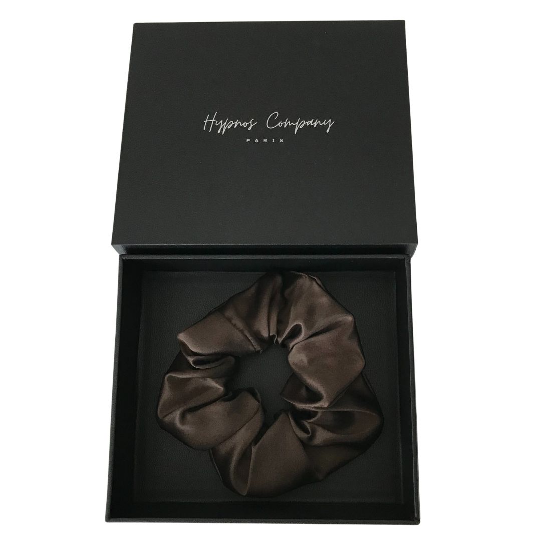 Nos chouchous en soie sont livrés dans de magnifiques boites en cuir noir, accompagnées d’une petite carte avec un message manuscrit personnalisé.